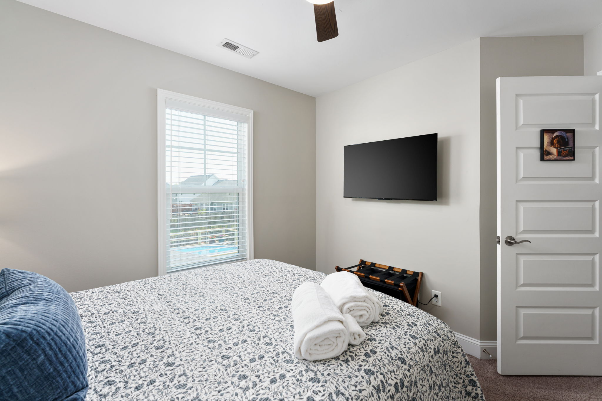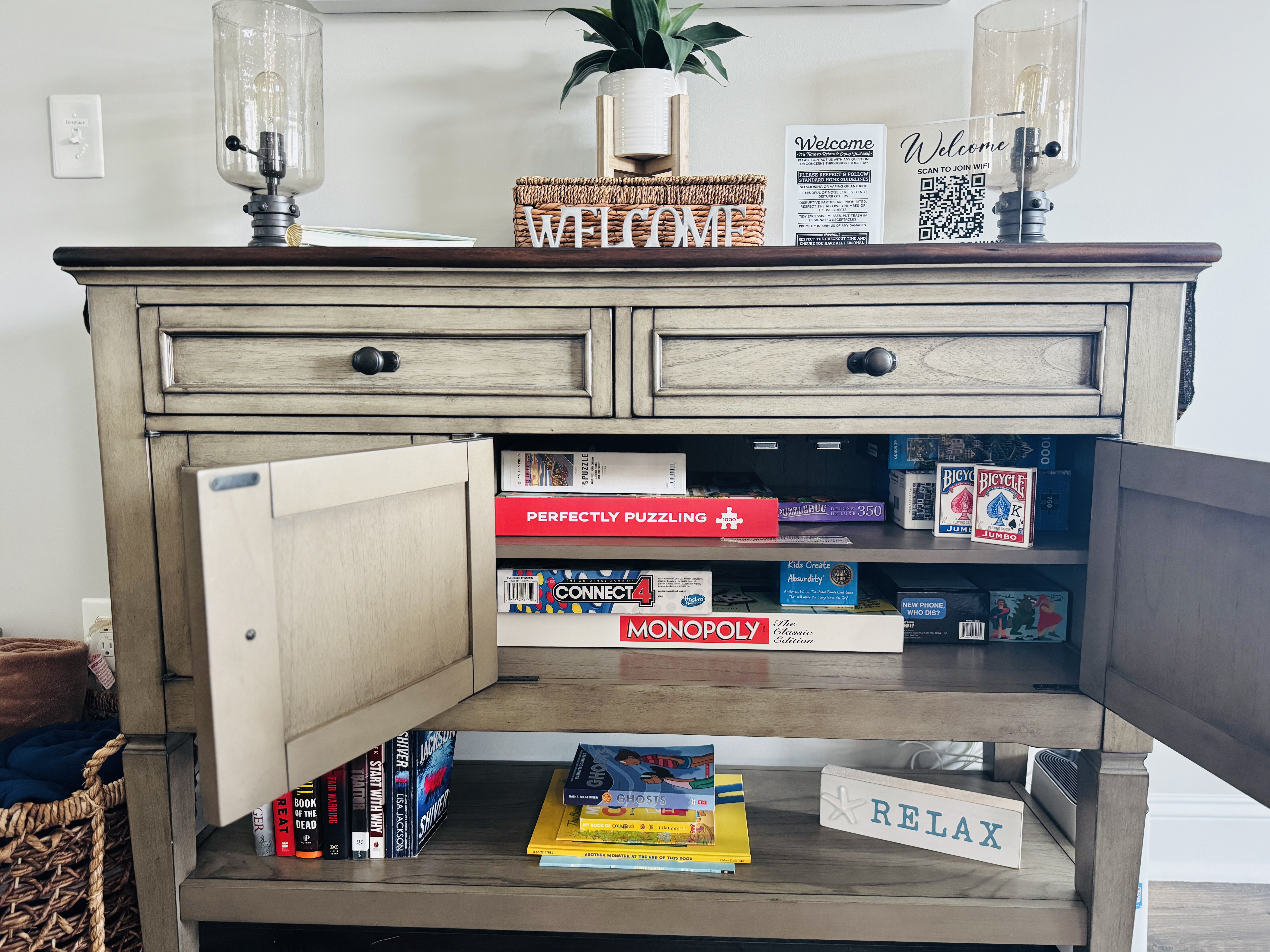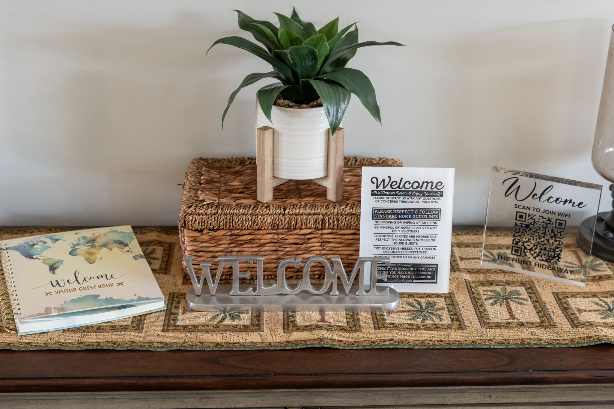 Designed for individuals, couples and friends, families, groups, your four-legged crew, traveling professionals, and longer stays, this home is designed for comfort, convenience, and easy living. We accept up to 8 guests. It's wedding season, so make sure you book your place to relax before and after all the festivities! Check-in is simple and contactless with a smart keypad lock. The neighborhood is residential and family-friendly, and the home backs up to open community space for a more private, peaceful backyard experience. Whether you’re visiting Wilmington for the beach, family time, a wedding, school events, or a longer stay, this home offers the space, privacy, and amenities to make your trip easy and memorable. CLOSE TO IT ALL You’re close to everything Wilmington has to offer: • Airport: 5 minutes • Wrightsville Beach: 11 miles/20-25 minutes • Blue Clay Bike Park: less than 5 minutes • Downtown Wilmington: 15 minutes • Mayfaire Town Center: 20 minutes • Porters Neck: 15-20 minutes • UNCW: 15 minutes • CFCC Main Campus: 10 minutes • CFCC North Campus: 5 minutes • Novant Medical Center: 15 minutes • Easy access to I-140 and the bypass Bringing your clubs? There are 20 golf courses within a 15-mile radius, with a mix of public and private. Check out world-famous Eagle Point Golf Club, Wilmington Municipal, Beau Rivage, Porter’s Neck Country Club or the many others around the area. COZY LIVING SPACE Large sectional couch and reclining chair lets everyone in your party gather around the big screen TV to watch your favorite show or movie, game, or stream music. Enjoy game night? We have several games to choose from in the welcome cabinet as well as puzzles to put together. Our pantry behind the couch includes a pack n play, BBQ utensils, outdoor serving dishes, and a few cleaning items for use during your stay. Flow from the living space to the high-top table to get all 8 of you around the table. Only two of you? Enjoy our breakfast bar attached to the fully equipped kitchen. Kitchen highlights: - Coffee Maker for a full pot of coffee, or individual pods – includes creamer, sugars, a sampling of regular and decaf Pods and ground coffee, hot chocolate powder and Pods - Hot water kettle with assortment of tea bags - Coffee mugs galore! - Crockpot - Toaster Oven/Air Fryer - Gas range - Blender - Cooking utensils - Indoor and separate outdoor plates and cups, wine glasses, and drink glasses - Eating utensils - Pots & pans, baking dishes, cookie sheets, and glass storage containers for left-overs - Cleaning wipes, sprays, kitchen sponge, paper towels, trash bags, dish soap, and dishwasher Pods - Fire extinguisher is under the sink Enjoy the half bath located off the kitchen for ease and convenience. Wanting to grill or eat outside? Our sliding doors lead straight to the backyard—perfect for indoor/outdoor living. BACKYARD OASIS Enjoy your own private outdoor space with: - Above-ground saltwater pool + deck, lounge chairs rocking chairs, and seating for up to 8 - Propane fire pit with seating for 8 - Grill-friendly setup for meals outside (seating for 8!) - Fully fenced yard (great for kids + pets) Enjoy the sunset and breezes as the evening winds down. Solar tiki lights come on as well as string lights around the pool to add to the cozy evening ahead. Ready to retire or just want to relax in your own space? Head upstairs! UPSTAIRS Upstairs you’ll find all four bedrooms and two full baths. Beds are made and ready for your stay. Enjoy our creature comforts like bath towels, shampoo/conditioner, bath gel, and other various sundry items for your stay. Each bedroom has a smart TV (sign in to your favorite streaming services!) and closet to keep you organized. PRIMARY BEDROOM #1 - King size bed (Medium Firm mattress) - ENSUITE private bathroom with two sinks, shampoo, conditioner, shower gel, bath towels, and makeup removal towels - Luggage rack, large walk-in closet, and dresser - 55” Smart TV - Cozy reading/lounge nook with separate Smart TV - Side tables and lamps with charging stations for headphone (e.g., Airpods), phone, and smart watch charging (just place your items on the dock and they should connect!) - Full sized mirror - Ceiling fan BEDROOM #2 - Two twin beds (Medium feel mattresses) - Shared nightstand with lamp and two charging stations - Closet with two hanging shelves to store folded clothes, luggage rack, and full-sized mirror - Smart TV - Ceiling fan BEDROOM #3 - Queen size bed (Firm mattress) – mattress topper in closet to soften the mattress - Two side tables with lamps and charging stations - Large walk-in closet and luggage rack - 43” Smart TV - Ceiling fan BEDROOM #4 - King bed (Medium mattress) - Two side tables with lamps and charging stations - Walk-in closet, dresser, and luggage rack - Cozy chair for relaxing - 55” Smart TV HALLWAY CLOSET - Beach Towels - Extra Blankets - Sunscreen and bug spray to use at The Hunt Hideaway pool and backyard - First Aid kit - Forgot your flip flops? We have several sizes to choose from, including size 12-13 and smaller for kids GUEST BATHROOM - Two sinks - Shower and bathtub - Shampoo, conditioner, shower gel, bath towels, and makeup removal towels LAUNDRY ROOM - Laundry room conveniently located near bedrooms - Stocked with Pods and dryer sheets for your use during your stay - Iron and Ironing board FITNESS CENTER IN GARAGE - Treadmill - Adjustable weights - Fitness bands POOL/BEACH ITEMS We offer items for the pool and beach. Please be respectful of keeping these items clean and damage-free so other guests can enjoy them after you. - Beach chairs - Beach mats/towels (sand free) - Pool/Beach towels - Pool noodles/floating loungers (please do NOT take to the beach, for Pool use only) - Kids beach toys - Small cooler SMART HOME - Keypad digital front door lock - Nest thermostat with upstairs + downstairs temperature control/zones - Smart lighting with motion sensors - SMART TVs PARKING - Drivewa